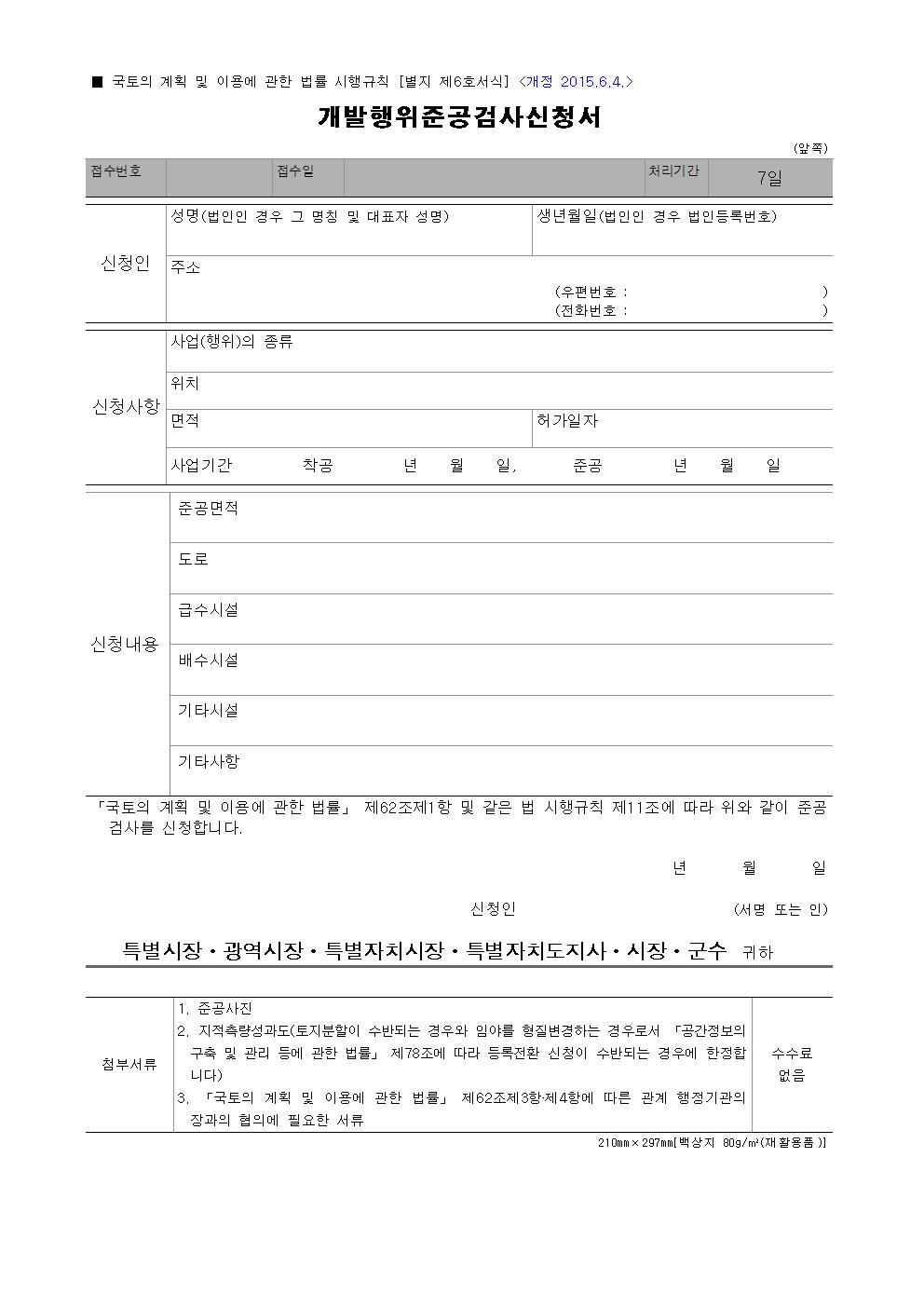 [별지 제6호서식] 개발행위준공검사신청서(국토의 계획 및 이용에 관한 법률 시행규칙).hwp