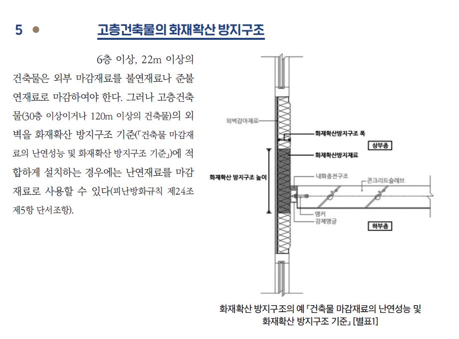 ⑥ 영 제61조제2항제1호부터 제3호까지의 규정 및 제5호에 해당하는 건축물의 외벽에는 법 제52조 제2항 후단에 따라 불연재료 또는 준불연재료를 마감재료(단열재, 도장 등 코팅재료 및 그 밖에 마감재료를 구성하는 모든 재료를 포함한다. 이하 이조에서 같다)로 사용해야 한다. 다만, 국토교통부장관이 정하여 고시하는 화재 확산 방지구조 기 준에 적합하게 마감재료를 설치하는 경우에는 난연재료(강판과 심재로 이루어진 복합자재가 아닌 것으로 한정한다 )를 사용할 수 있다.<개정 2019. 8. 6., 2021. 9. 3., 2022. 2. 10.