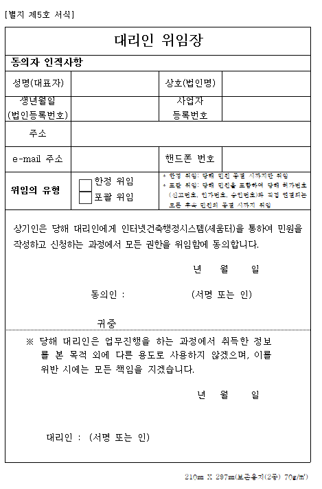 건축물 허가를 진행하시게 되면 대리인 위임장이 필요합니다.