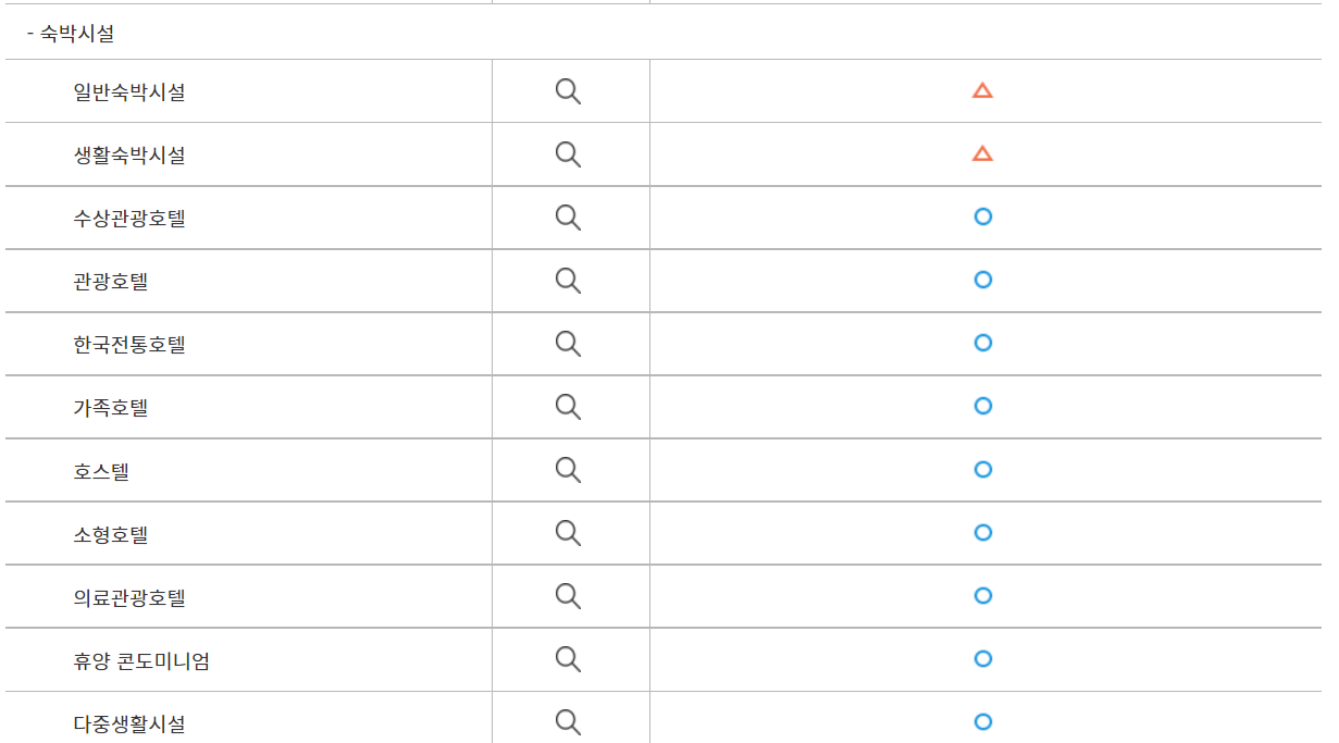 다양한 숙박시설들이 있습니다. 그중 일반숙박시설, 생활숙박시설은 세모로 체크가 되어있는데요.