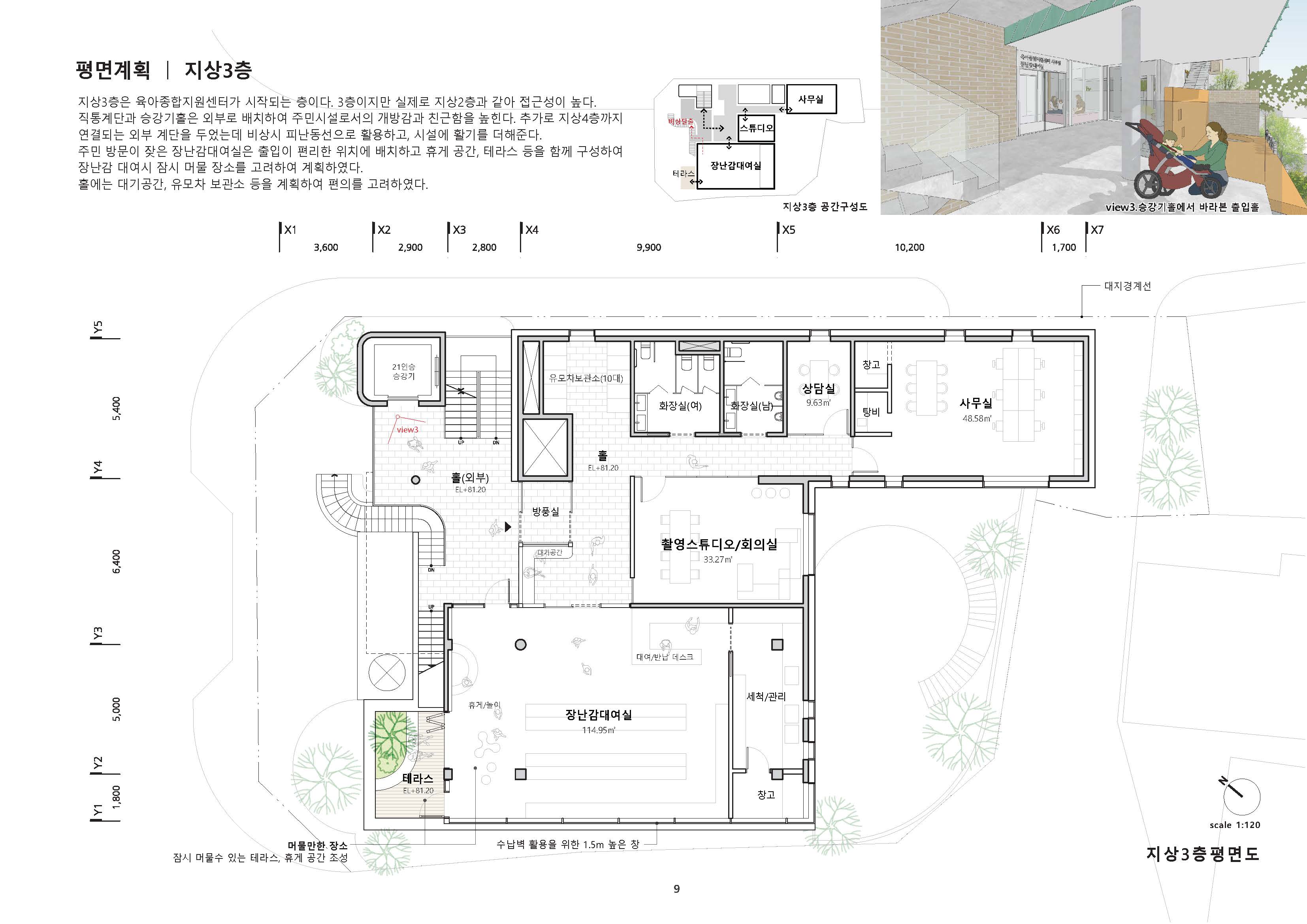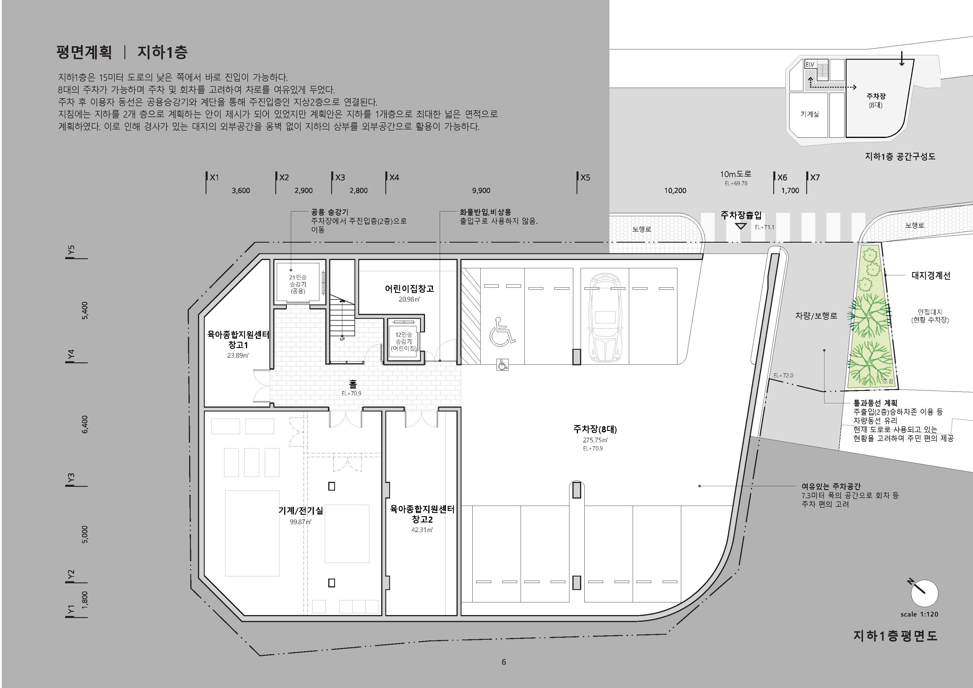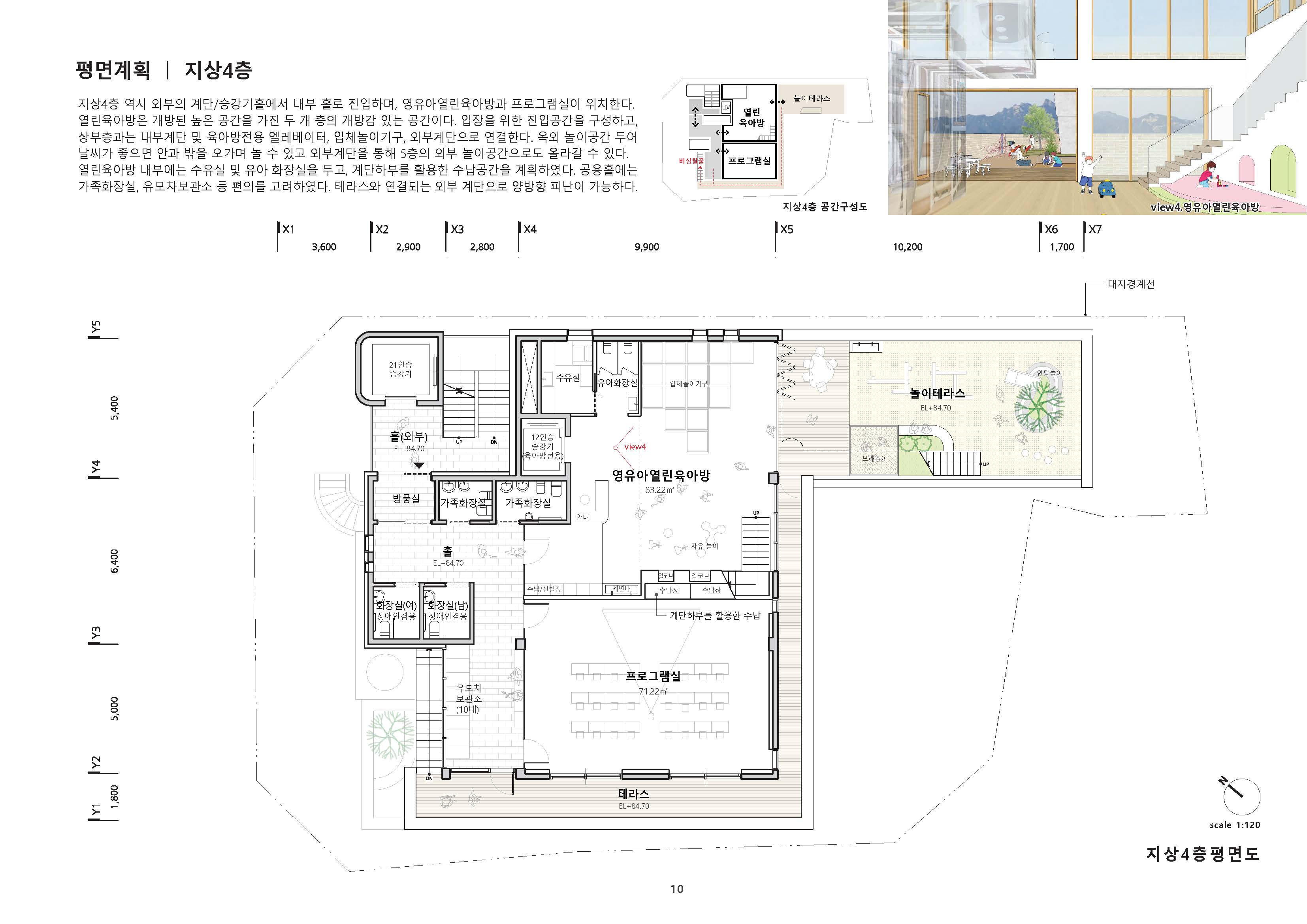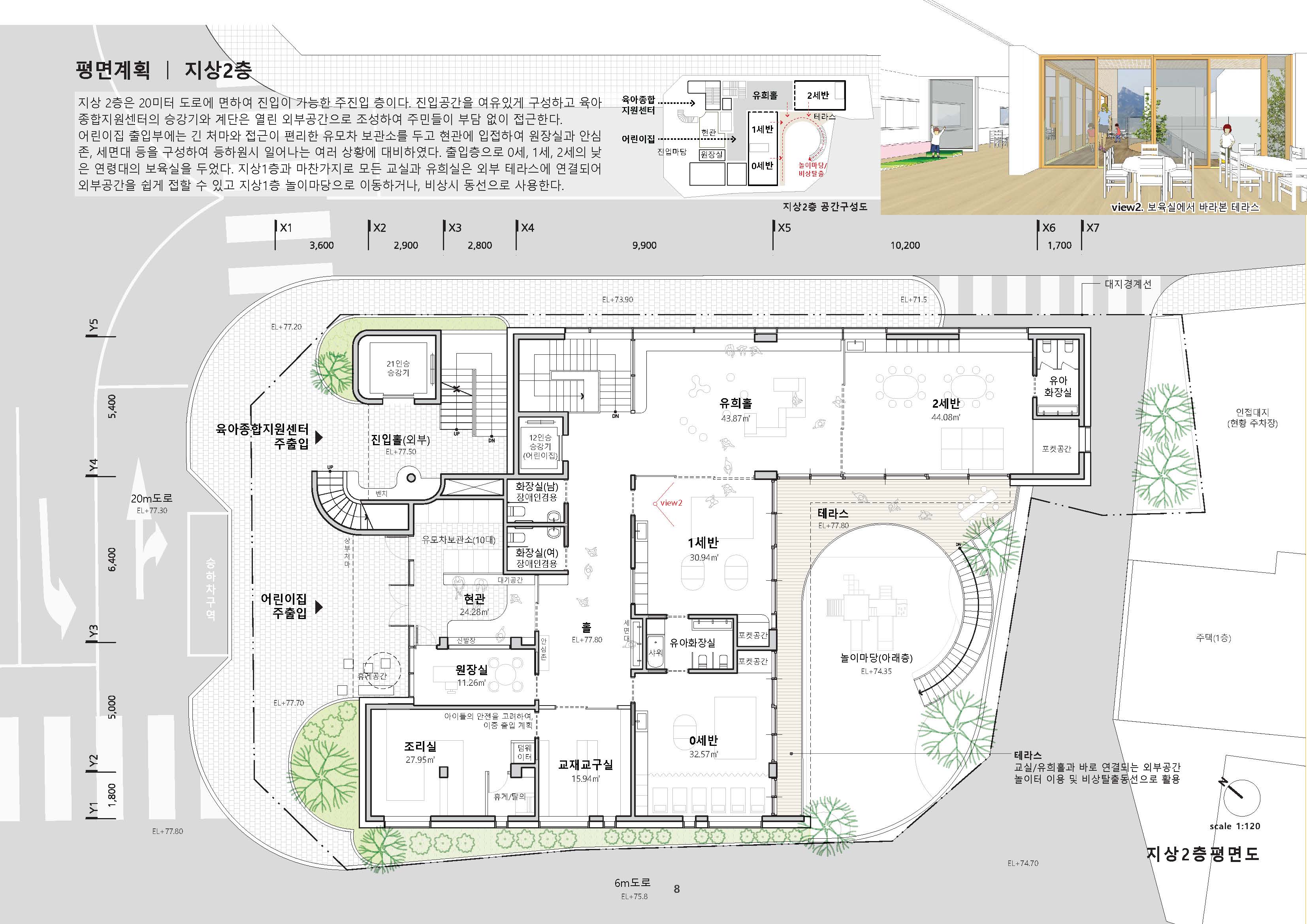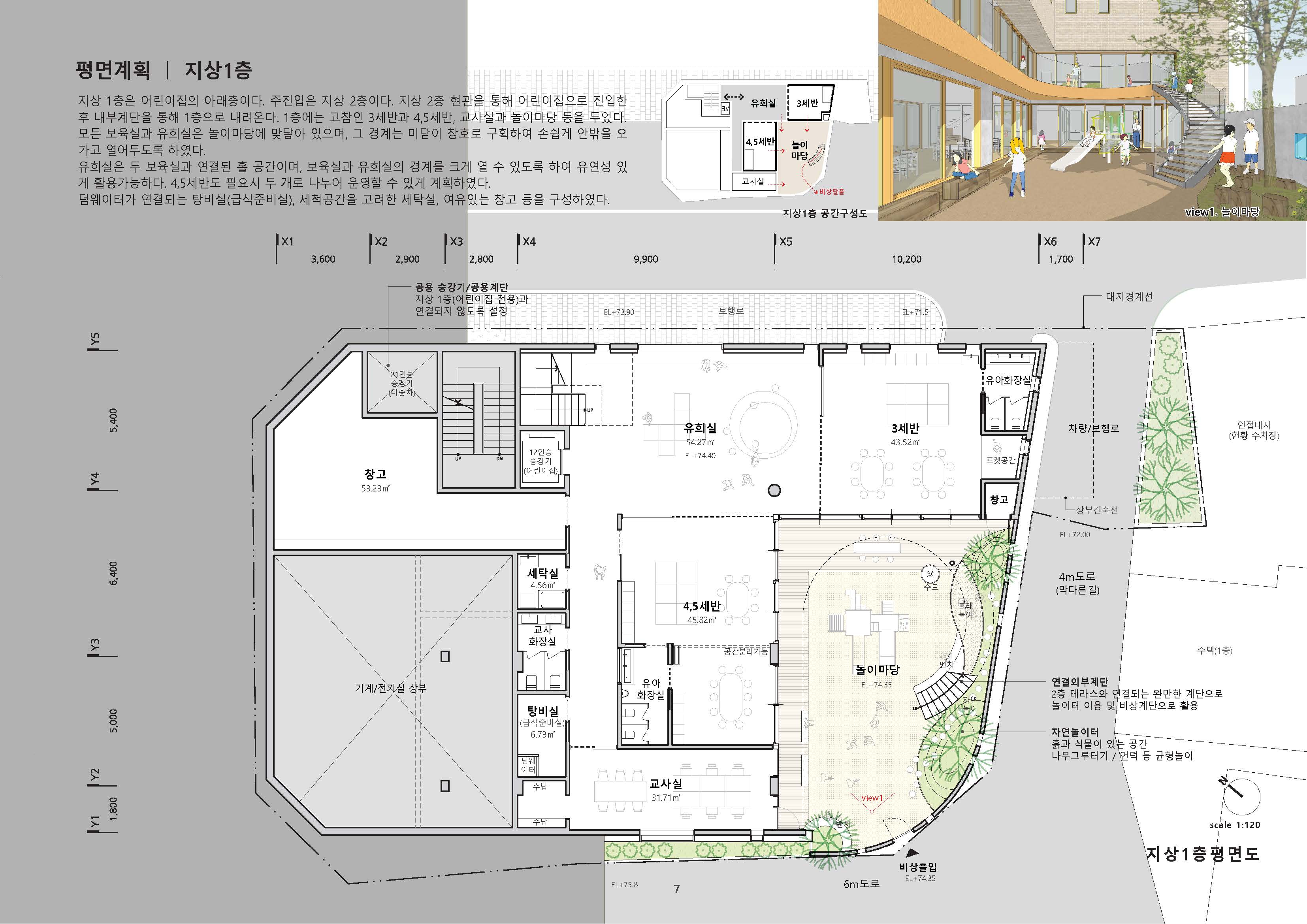 진입층에 영아반을 위치시키고 대지의 단차를 효과적으로 활용하여 아랫층에 3~5세 반을 설치하여 야외 놀이공간을 직접적으로 활용한 부분이 우수함