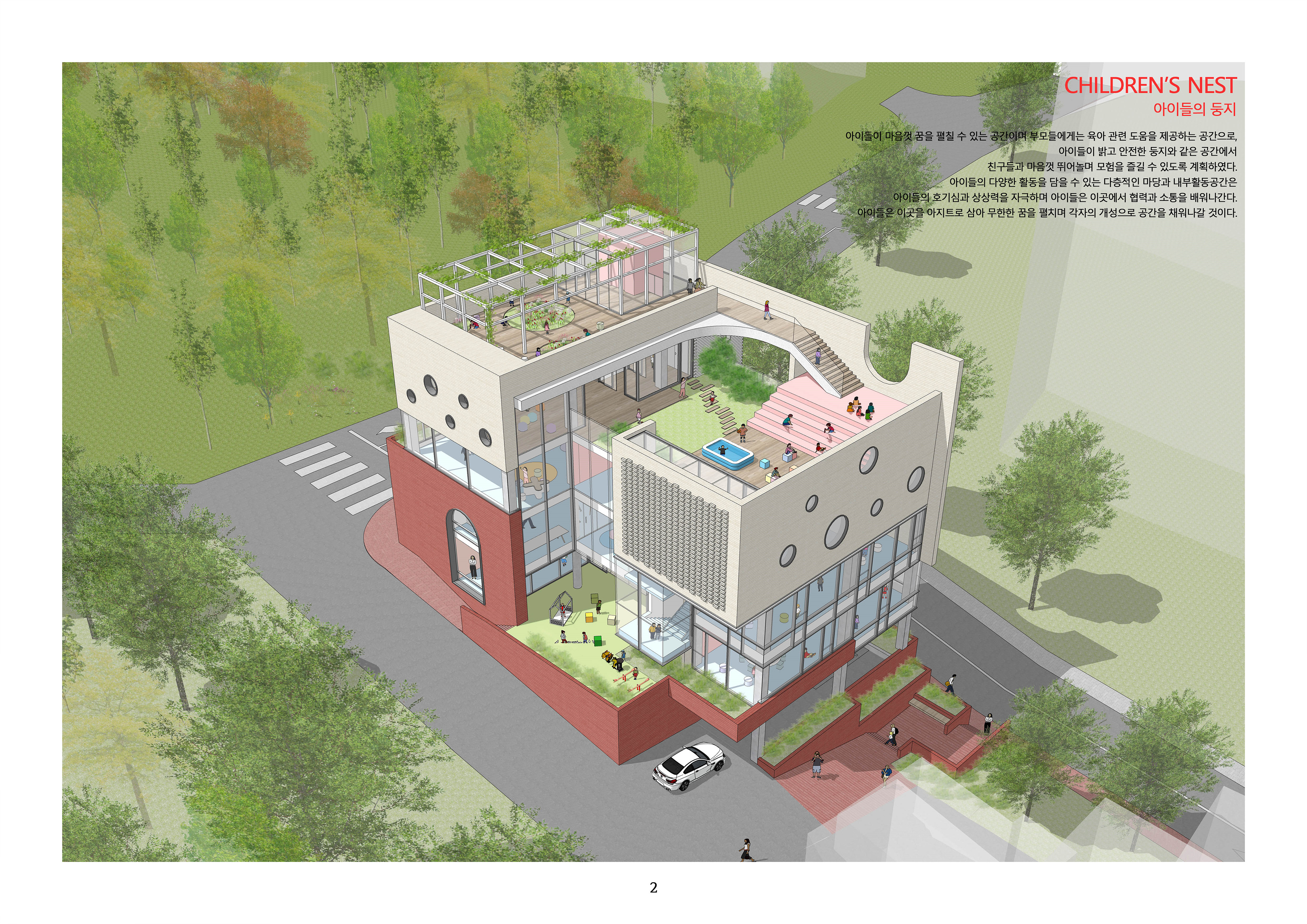 아이들 외부공간의 아이디어가 당선을 결정지어보임.