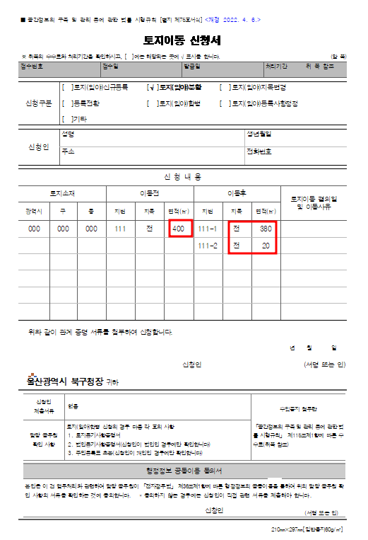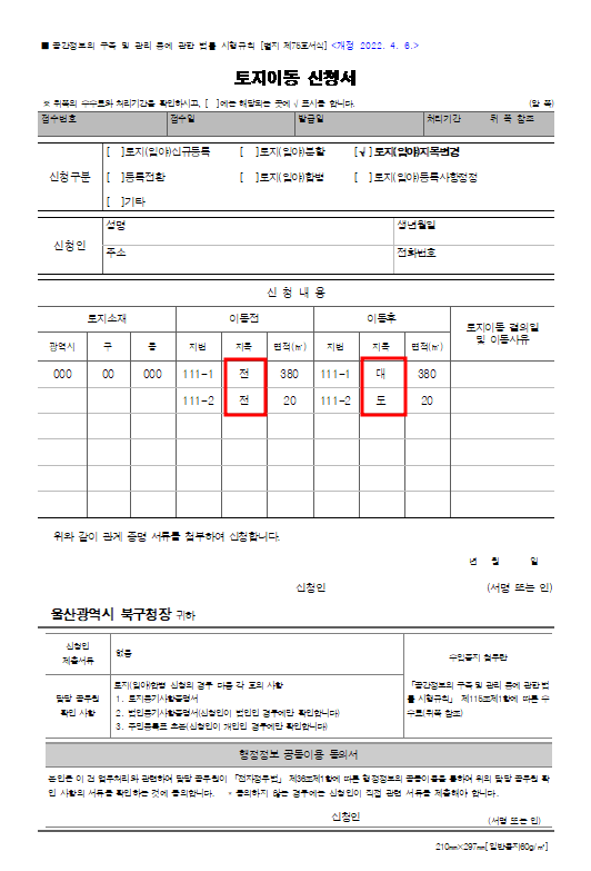 토지이동 신청서를 준비하게 됩니다. 모두 하는 것은 아니며