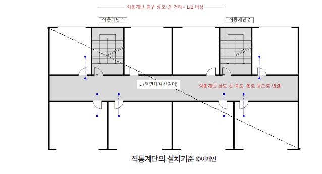 현재는 법이 개정되어 두 개의 계단도 상호 간의 거리가 법규로 명시되어 있습니다.